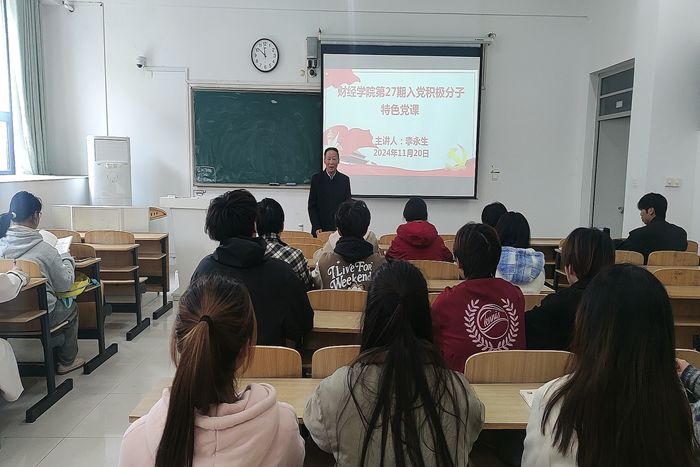 11月20日下午,财经学院在致知楼C107教室开展第27期入党积极分子特色党课。本次党课特别邀请校关心下一代工作委员会副秘书长李永生担任主讲。