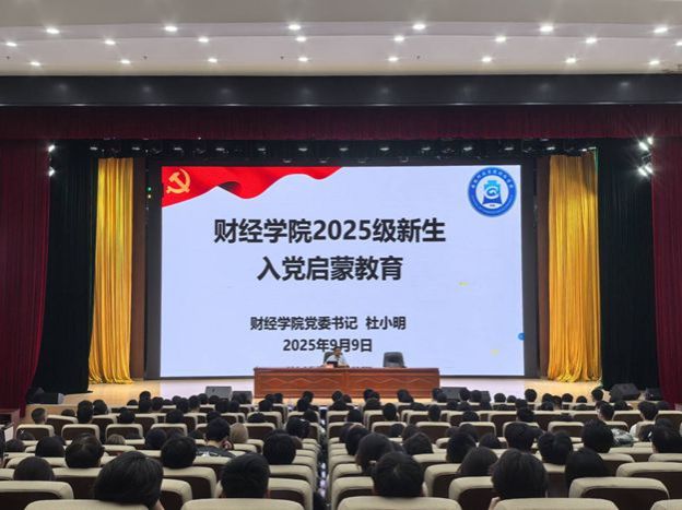 为加强新生思想政治引领,夯实理想信念根基,引导广大新生积极向党组织靠拢,9月9日晚,财经学院于东辅楼二楼报告厅举办2025级新生入党启蒙教育大会。学院党委书记杜小明担任主讲,学院全体新生辅导员及2025级全体新生参加。大会由学院党政办主任张俊主持。