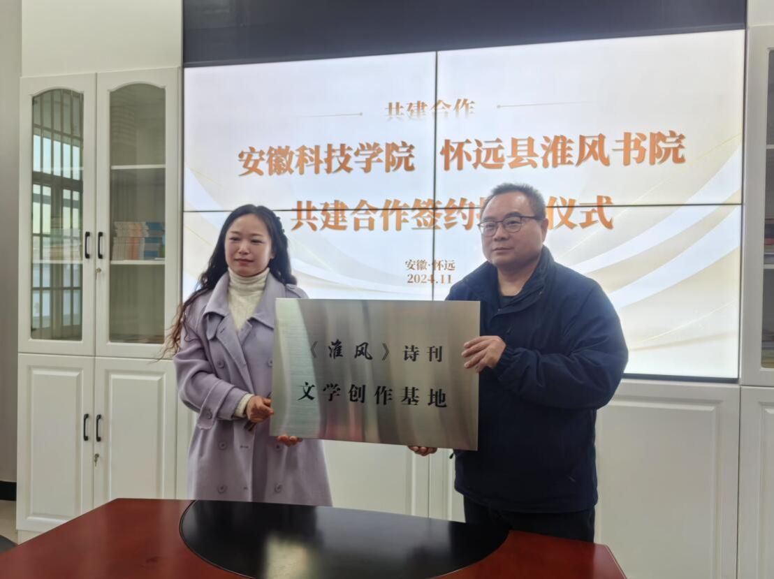 在签约暨授牌仪式上,李晓东、宫蔚国分别代表双方签署了共建实习实训基地协议,并举行“安徽科技学院共建合作基地”“《淮风》诗刊人才培养基地”“ 《淮风》诗刊文学创作基地”授牌仪式。