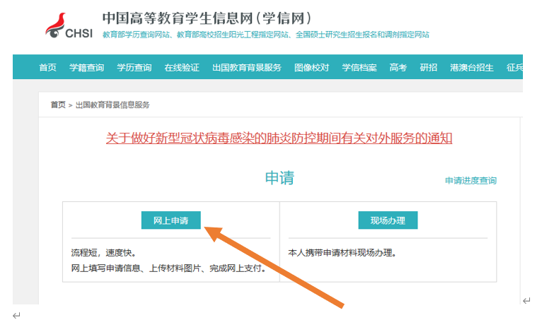 4、点击“点击进入网上申请系统(Start an Application)”按钮,按步骤操作,生成“中国高等教育学历认证报告”。