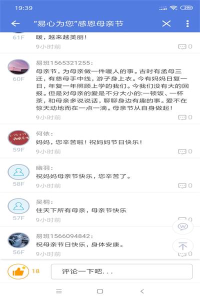 本次活动以在“易心为您”感恩母亲节的主题帖下评论进行开展,广大建筑学子争先留言,互相讨论,书写着对母亲的心理话,分享着自己在母亲节的种种感悟,一声“妈妈,您辛苦了!”这究竟蕴含了多少情感?整个活动的过程中大家都非常积极的参与讨论,而且在参与活动过程中收获良多,都能体会到母亲的不易,已达到活动预期效果。