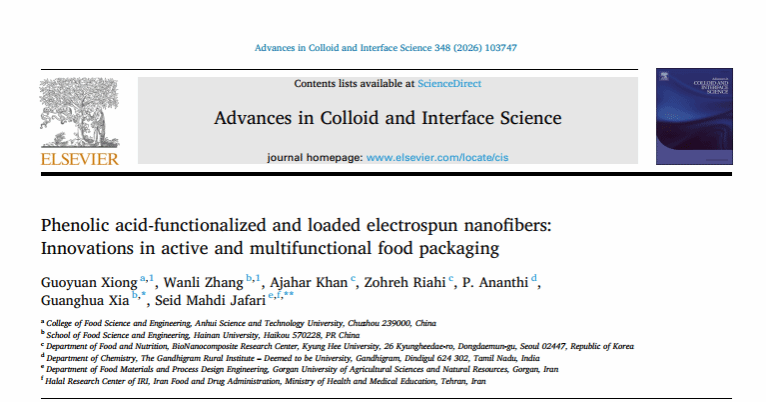 近日,我校食品科学与工程学院“特色食品绿色高效加工与创制”省级优秀科研创新团队带头人在Elsevier期刊《Advances in Colloid and Interface Science》(中国科学院一区TOP,IF 19.3)发表学术论文《Phenolic acid-functionalized and loaded electrospun nanofibers: Innovations in active and multifunctional food packaging》。我校熊国远教授和海南大学张万立副教授为文章共同第一作者,安徽科技学院为第一署名单位。