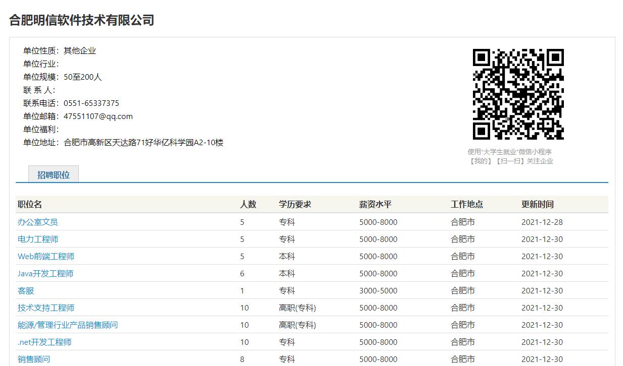 合肥明信软件技术有限公司创立于2004年,注册资金1010万元。依托合肥工业大学成立的一家双软企业和高新技术企业,位于合肥市高新技术开发区华亿科学园。近年来专注于《安全供电专家系统》、《安全供电云服务平台》、《电子商务交易平台》、《电子商务采购平台》的研发和推广。 公司研发的主要产品现应用于国内外上千家大型企业。公司全体员工秉承团结务实.开拓创新的精神,用最诚信的服务将最先进的技术带给广大客户。 福利待遇: 1.薪资6~15k/月,每年薪资调整1~2次,岗位有加班薪资、项目津贴,年终奖; 2.五险一金,餐补,交通补助,体检,工龄,旅游及节假日慰问等福利; 3.双休、节假日正常休。